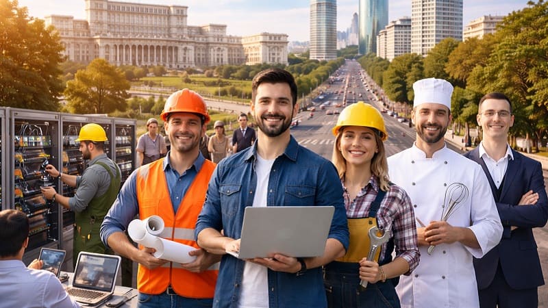 رومانی با توسعه صنعتی و ساخت و ساز روبه‌رو است و به همین دلیل تقاضا برای کارگران ماهر در این حوزه‌ها بسیار زیاد است. به‌عنوان مثال، مشاغل مرتبط با جوشکاری، آرماتوربندی، و نصب سازه‌های فلزی بسیار پرطرفدارند. علاوه بر این، مشاغلی نظیر پیکولو (کمک‌پیشخدمت)، پیتزاپزی و کار در صنعت ساخت و ساز نیز جزو فرصت‌های شغلی متنوع در رومانی به شمار می‌روند.